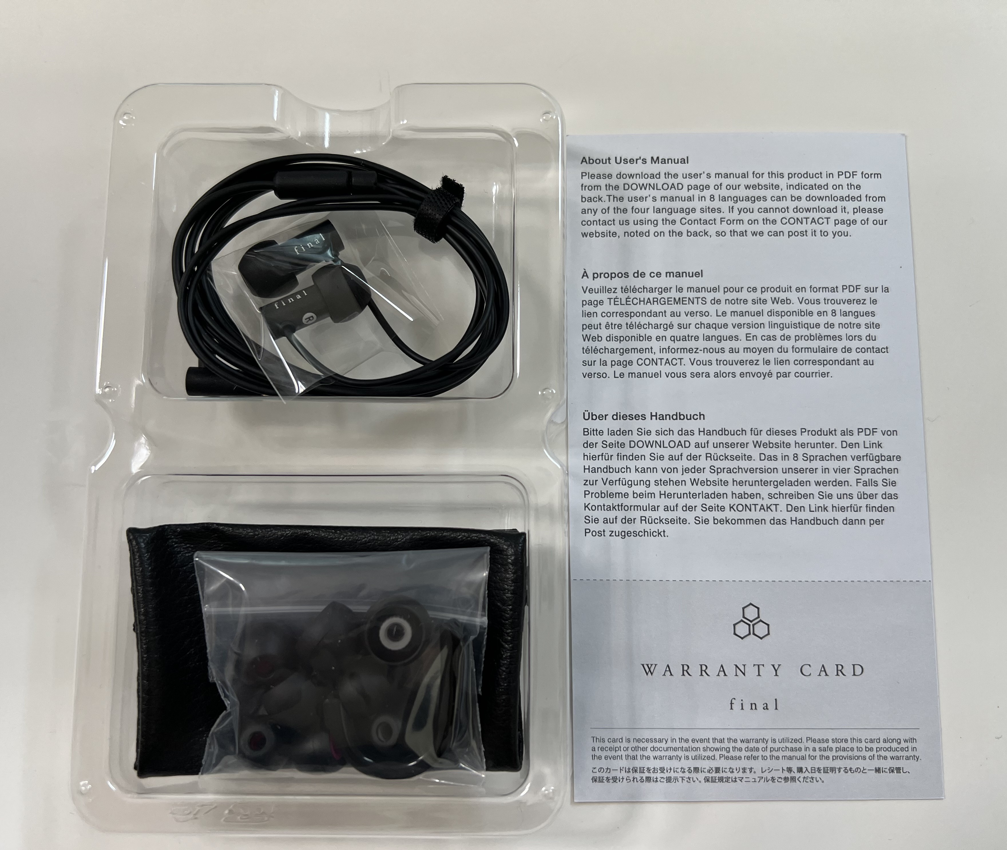 내부 구성품은 이어폰 본품이 있고 파이널 E팁 5쌍, 이어 가이드, 조그마한 파우치가 있는데