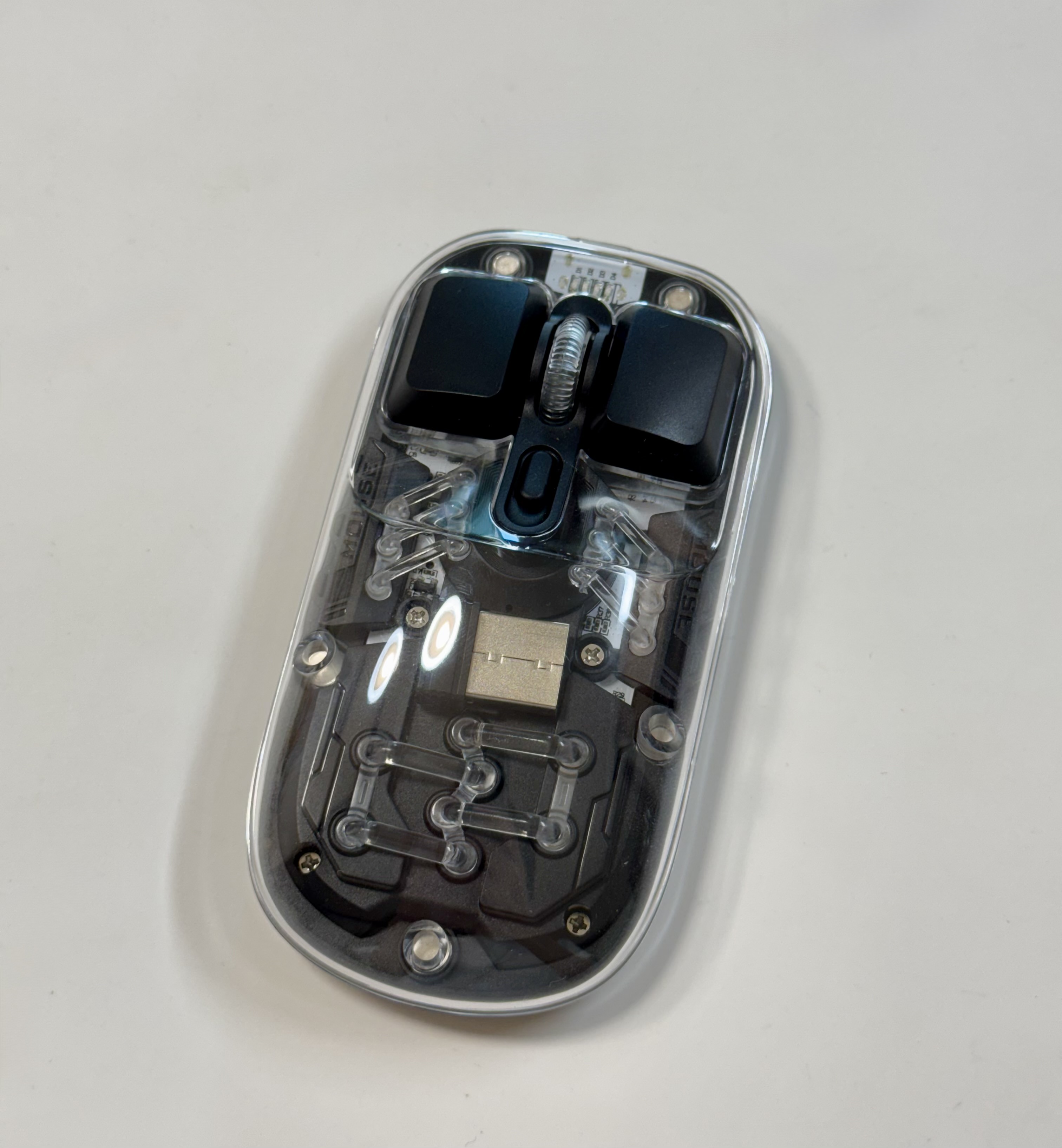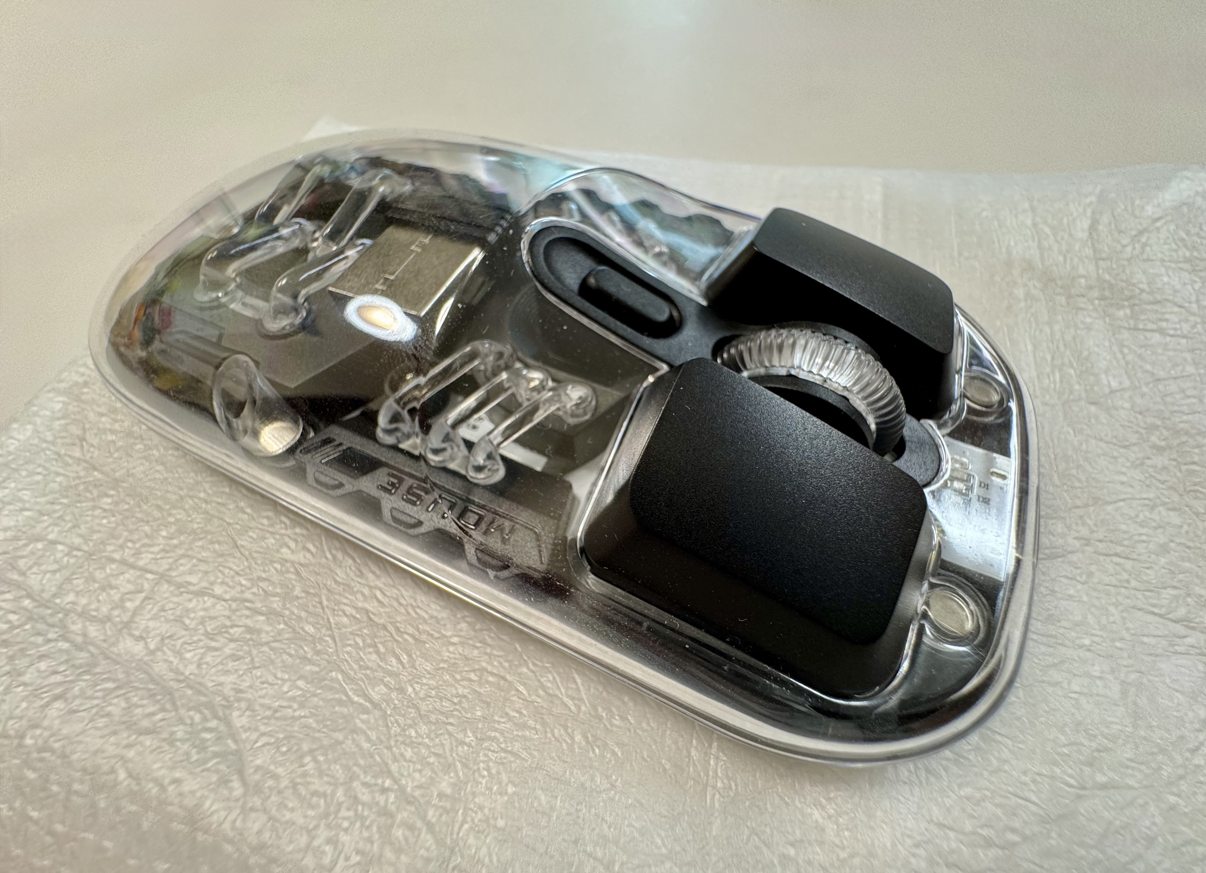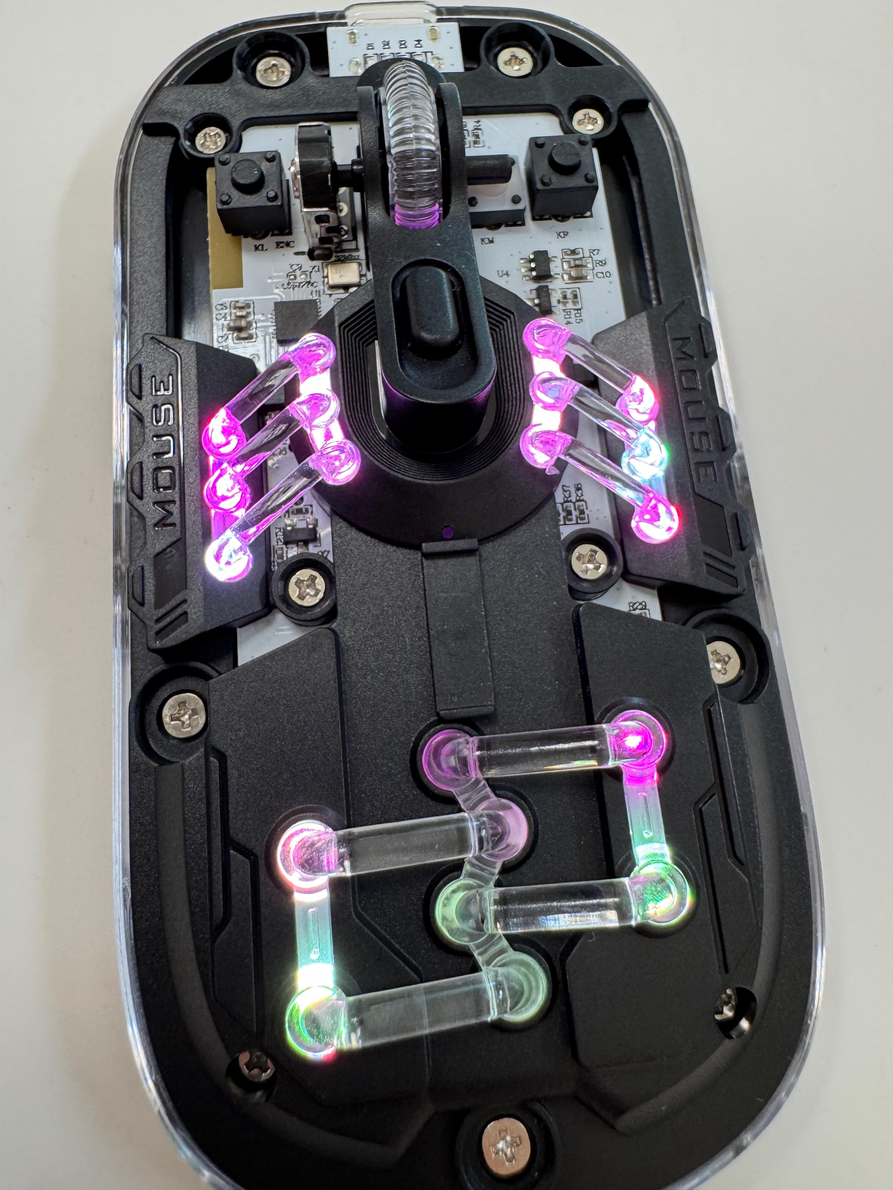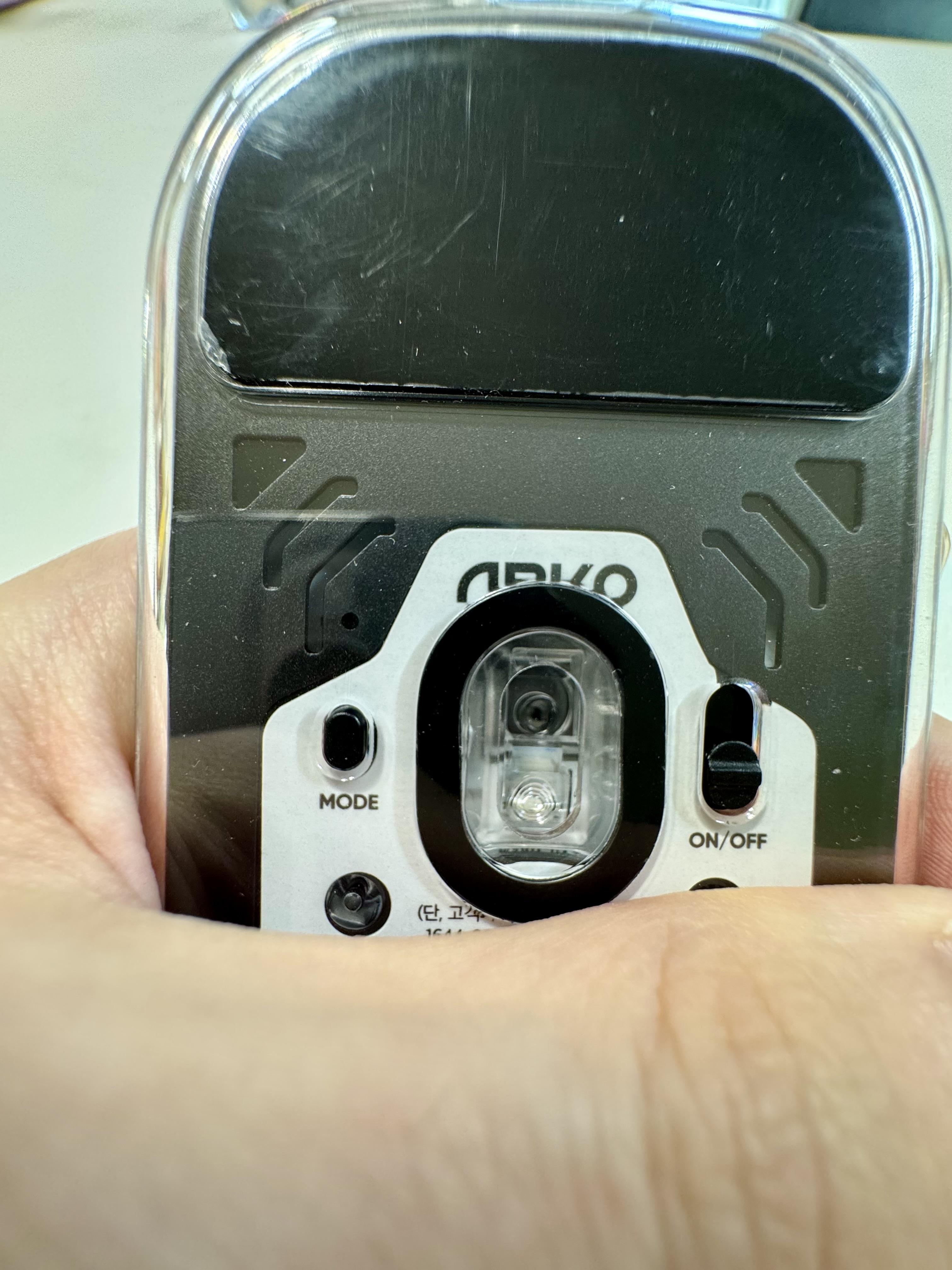 마우스를 켰다 껐다 할 수 있는 버튼이 있고 하단 또한 투명한 쉘로 마감되어 있고
