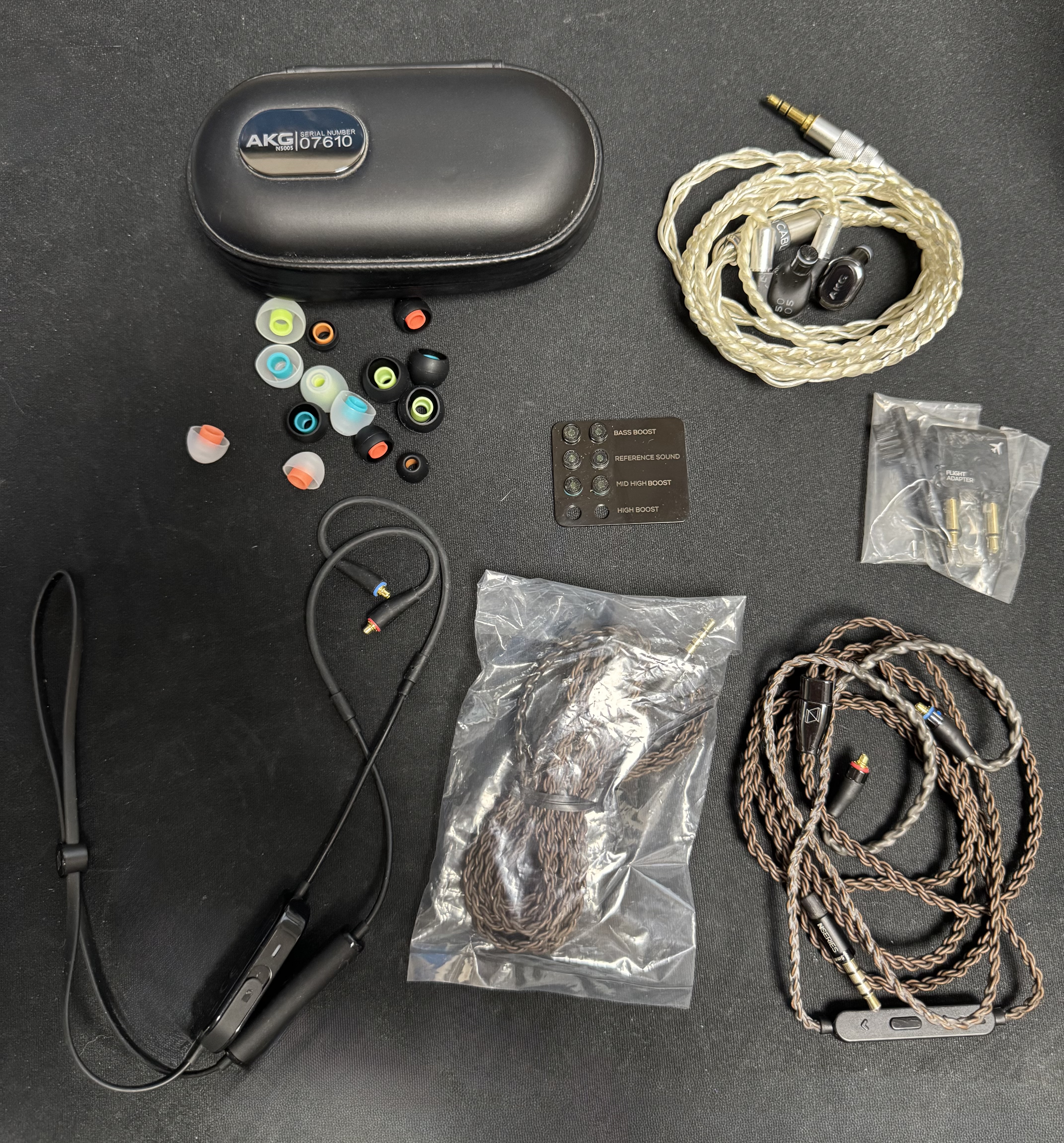 mmcx to 블루투스 케이블, 비행기용 변환 어댑터, 청소툴, 4종류 필터, 유닛이 있습니다